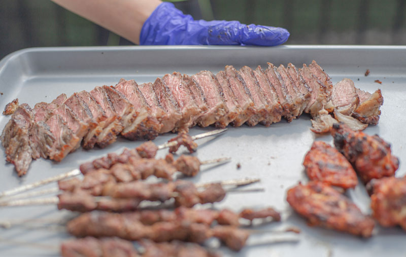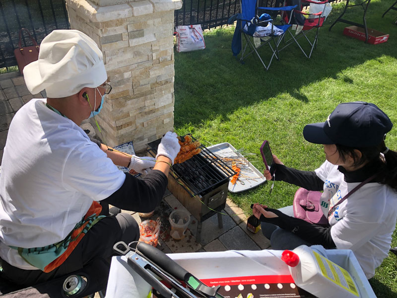 由于是现场烧烤,有大量的筹备工作需要完成,除了筹备组的五位成员,还动员了她/他们的家属和十多位义工,这些人都参与到从列出所需物品,采购,制备,腌制,等各道工序中。协会缺少烧烤工具,大家就自报奋勇奉献出自家的用品。缺少中式碳烤能手,桂在斌和曹景新就“无证上岗”,火线培训,由熊飞现场指导。