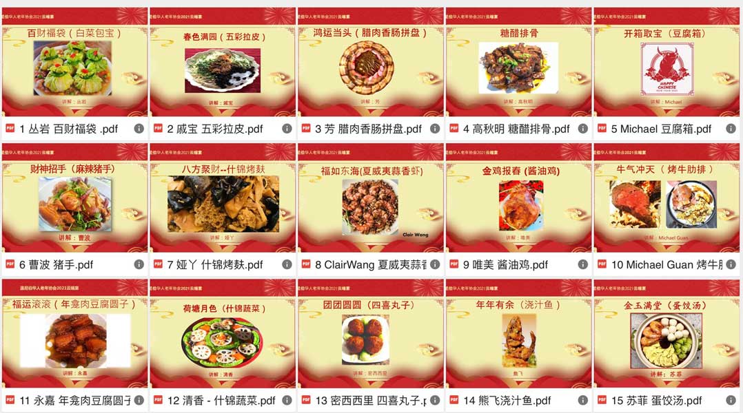 新春报喜,金牛贺岁 。在庆祝中国农历新年到来之际,WCSA厨艺俱乐部于1月30日为大家推出了一场春节“年夜饭”云端宴。这桌“年夜饭”一经展出,就受到了会员们的极大关注,被誉为:“曼汉”全席,香倾温城。那一盘盘精致的菜肴,就仿佛万紫千红一片春,不是开在室外,而是开在盘中,令人赏心悦目。有义工在电脑前整理这些菜谱的时候开玩笑说:“感谢大厨们的分享,口水流了一键盘。” 在这之前,WCSA厨艺俱乐部也曾于2020年10月10日和12月19日、27日分别举办过感恩节、圣诞节和元旦厨艺美食展。现在让我们一起来领略一下这些厨艺美食展的风采吧。