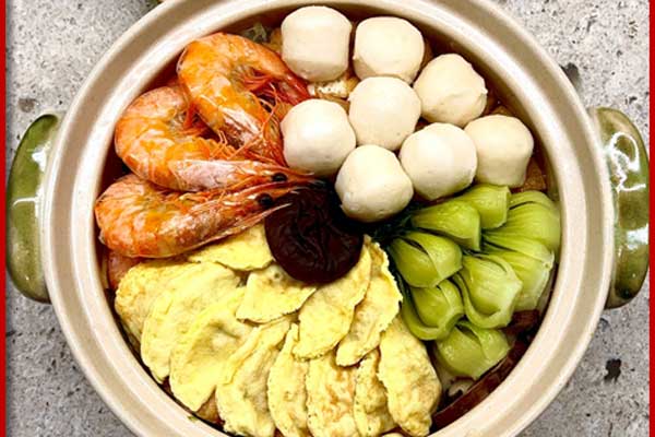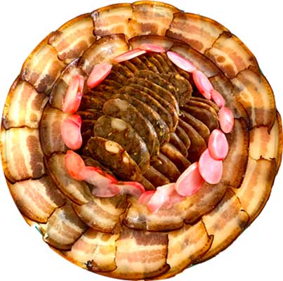 中国饮食一向着重品味和情趣,特别是遇到重大节日的时候,菜品的名称和寓意尤为重要,既要出神入化、雅俗共赏,又要寓意深刻、吉祥美好。给菜肴起名字也是一门学问,需要起名者博学多才,精通中国传统文化。菜名有些比较写实、有些比较抽象,或源于历史掌故、神话传说、名人食趣,或源于字词谐音、字义关联,或源于菜品的色、香、味、造型特征等等不一而足。从上图中我们可以看到,这次的菜名起得很有讲究,处处彰显着富贵吉祥的色彩、透视着中国饮食文化丰厚的文化底蕴。有些取之于谐音,有些取之于字义关联,有些取之于菜品的色彩、造型等等。取之于谐音的,如:百财福袋(白菜包宝),年年有余(浇汁鱼),金鸡报春(酱油鸡);取之于字义关联的,如 :财神招手(麻辣猪手),牛气冲天(烤牛肋排),;取之于菜品的色彩、造型的,如:春色满园(五彩拉皮),团团圆圆(四喜丸子),荷塘月色(什锦蔬菜),福运滚滚(年龛肉豆腐丸子),八方聚财(什锦烤麸),金玉满堂(蛋饺汤),鸿运当头(腊肉香肠拼盘),福如东海(夏威夷蒜香虾),步步高升(糖醋排骨),开箱取宝(豆腐箱)等等,当然,根据不同的分类标准,有些菜名也可以同时纳入不同的类别。