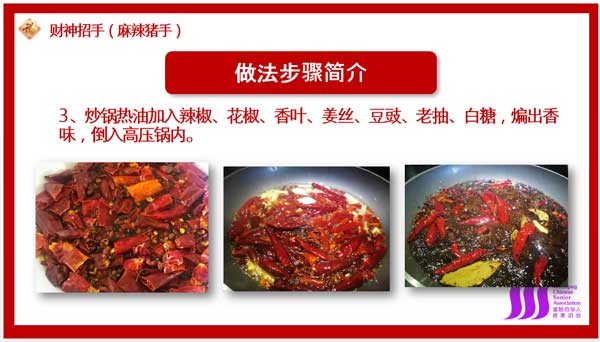 打开精美的食谱资料,我仿佛又听到了各位大厨们向我细说端详的声音…你听,曹波先生正在津津有味地讲他的财神招手(麻辣猪手)呢…他说:做这道菜主料是切块猪蹄,调料有食盐、料酒、老抽、醋、豆瓣酱、干红辣椒、麻椒、香叶、桂皮、葱、姜、蒜、香菜等;第一步是焯水去毛、去腥,第二步是放入姜片、八角、香叶、桂皮等佐料用高压锅开煮10分钟,第三步是将辣椒、麻椒、姜丝、豆豉、老抽、白糖等放入盛有热油的炒锅中煸香,再加入到高压锅中炖煮10分钟左右,这样一道清香四溢的财神招手(麻辣猪手)就大功告成了。听大厨们讲解,似乎很轻松易做,因为他们是“久经沙场”的老手了,实际做起来,还是需要一定功夫的。百闻不如一见,有时间欢迎大家参与到WCSA厨艺俱乐部举办的美食展活动中来,亲自感受一下温尼伯华裔大厨们精湛的厨艺吧。
