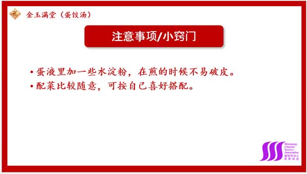 特别喜欢厨艺美食展中的“注意事项/小窍门”,这些小窍门或者是食材采购方面的或者是烹饪方面的抑或是有关“吃”的技巧等,都是大厨们多年实践经验的结晶,非常受用。例如:曹波先生在介绍上述菜肴时告诉大家买猪蹄时要买猪前蹄,骨小肉多、蹄筋多,富含胶原蛋白等,这些可都是真正的技巧,相信很多人不一定知道;再如:芳在讲鸿运当头(腊肉香肠拼盘)的时候提醒大家做腊肉最好的时间是每年十月下旬温度在零上几度的时候;苏菲在讲到金玉满堂(蛋饺汤)时交代大家在煎蛋时适量加一些水淀粉,能保持蛋皮完整等。真是小厨艺,大学问啊。