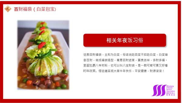 WCSA春节“年夜饭”云端宴上共有15个 菜品,都是全国各地年夜饭餐桌上的佳品,是经过WCSA 厨艺俱乐部筹委会为大家精心挑选出来的比较有特色的菜肴。大厨们每人利用五、六分钟的时间向大家介绍了菜品的相关年夜习俗如:菜品的特色、风俗、寓意等;然后就菜品的主、配料、具体做法等作以详细介绍;最后还为大家总结出一些注意事项/小窍门。丛岩的百财福袋(白菜包宝)是用焯水以后翠玉般晶莹透亮的白菜叶包上八样食材如:火腿粒、玉米粒、胡萝卜粒、香菇粒、青豆、小白萝卜粒、芹菜粒等馅料包成福袋的形状,用焯水香菜充当绳子系住袋口,然后再用红色的枸杞子点缀,红绿相映、造型美观、犹如含苞待放的花朵一般,让人大饱眼福;戚宝的春色满园(五彩拉皮) 是东北地区家喻户晓的、重大节日里不可或缺的一道凉拌菜。这道菜有五、六种色彩缤纷的蔬菜如大白菜、胡萝卜、紫甘蓝、黄瓜、粉皮、豆腐丝、香菜等组成,仿佛姹紫嫣红的小花园一般,令人垂涎欲滴;苏菲的金玉满堂(蛋饺汤)是江浙一带的传统年菜。金黄色的蛋饺形似元宝,寓意招财进宝。再加上鱼丸、大虾、豆腐泡、青菜、蘑菇等配料,食材丰富、色泽鲜艳,造型如盛开的花朵一般,红黄白绿,让人赏心悦目;熊飞的年年有余(浇汁鱼)金黄艳丽,造型昂扬向上,栩栩如生,具有年年有余、奋发图强、和鱼跃龙门的美好象征,增加了节日欢乐喜庆的气氛。15道菜肴,不能一一述说,盘盘菜品都貌美如花、匠心独运,彰显着大厨们高超的技艺和智慧,不愧为“曼汉”全席,香倾温城!每次美食展以后,我都会一遍一遍地欣赏着那一盘盘貌美如花的菜品、回味着大厨们的厨艺“精华”,舍不得把它们“束之高阁”,这时身边的先生总会为我着急,斟上两杯酒,带点戏谑的口味说:“来,就着你的‘云端美食’,‘晚来天欲雪,能饮一杯无?’” 逗得我一笑方休。