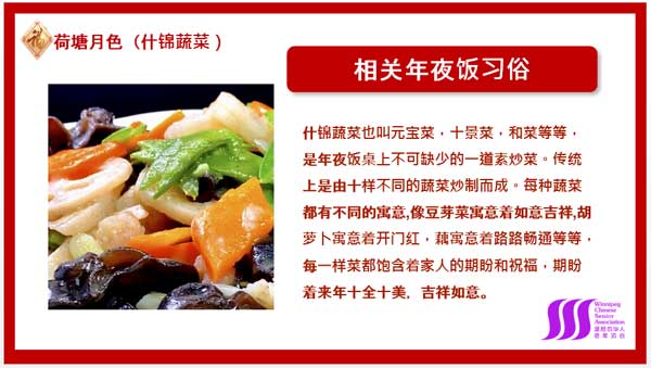 WCSA厨艺俱乐部举办的春节“年夜饭” 云端宴晚会无处不透露着知识的气息,文化的底蕴。主持人首先介绍了春节“年夜饭” 的重要意义,并进一步阐述了各地常见的春节习俗。接下来各位大厨们对每一道菜的介绍更是让人眼花缭乱,深感中国饮食文化的博大精深。每一道菜都有着不同的寓意。例如:丛岩女士在讲百财福袋(白菜包宝)这款菜品的时候,就讲到了它的寓意。她说白菜与“百财“谐音,做成福袋造型,寓意百财进家,富贵吉祥,多财多福等,因为里面包有八种食材,所以又称为八宝财袋;再如:唯美女士在讲金鸡报春(酱油鸡)的时候,说 “鸡”与“吉”谐音,象征着吉祥如意、大吉大利的意思;根据“鸡”的不同部位做出来的菜肴也有不同的寓意:鸡翅代表着展翅高飞、大展宏图、飞黄腾达;鸡汤代表着清泰平安;鸡爪代表着新年抓财;鸡骨头代表着出人头地等;永嘉在讲福运滚滚(年龛肉豆腐丸子)这道菜时,曾提到年龛肉是春节时用来供奉神仙的供品,能吃到这种肉寓意着来年能消灾避难、平平安安;还有清香女士在讲到荷塘月色(什锦蔬菜)的时候,说什锦菜一般有十样蔬菜炒制而成,不仅寓意着十全十美,而且其中的每一样蔬菜还有不同的寓意如:豆芽代表吉祥如意,胡萝卜代表开门红,莲藕代表路路畅通等,每一样菜都包含着对来年的期盼与祝福。多么美好的寓意啊!这场晚会让会员们深深地感受到它不仅仅是一桌春节“年夜饭”而是一场文化盛宴,其中蕴集着许多方面的知识。