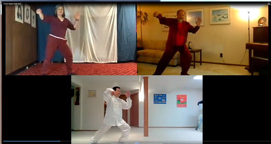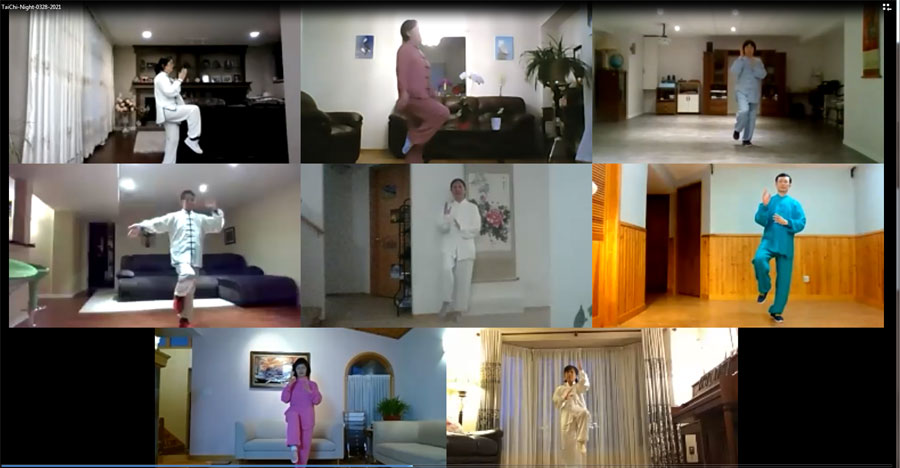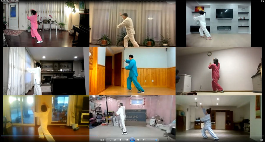 太极之夜晚会由老年协会太极拳班教练彭继伟先生和太极拳班班长无限先生策划,老年协会组织,并由老协义工朱蕾女士和无限先生主持。晚会节目丰富,表演精彩,深受大家的欢迎,共有129人次或家庭踊跃参加。表演的节目不拘一格,形式多样,有男子组表演、女子组表演、男女混合组表演、温柔组(老年组)表演、非华裔朋友表演、师傅引领与观众互动表演、还有彭继伟师傅的精彩示范表演等,除了太极表演,还有简化太极拳招式诗朗诵、《牧羊曲》女声小合唱、金鸡独立站桩表彰和表演、太极拳拳友习练体会分享以及中国武汉方舱医院医生们带领新冠病人习练太极拳的视频介绍等。下面让我们截取几个镜头来欣赏一下他们的表演。