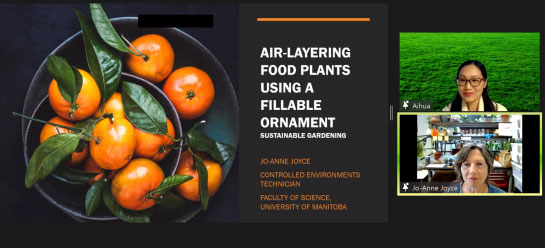 原来Jo-Anne Joyce女士是用一个白色透明的、通常用作圣诞节装饰品的塑料球作为果树繁育的“小温室”,里面装上土,浇上水,把经过消毒处理以后的无花果果树的枝干采用空气分层压条的方法包在中间,让其在里面生根发芽,长出根须,再移栽到其它苗床里去的一个果树快速育苗的简便方法。“小球办大事,果树生根快”是大家听了这个讲座以后的感言,大家都产生了跃跃欲试的心理,连我们的姜彦会长都兴致勃勃地说:“有机会一定要尝试一下。”这就是这次科普讲座给大家带来的积极效应:Jo-Anne Joyce女士 把高深的知识用通俗的语言表达出来,使没有果树育苗知识的人也能清楚明白而且感觉简单易做,翻译者Aihua女士的翻译精准到位,通俗流畅,关键时候采用意译,让内容清楚明了,受到了大家的高度赞誉。Jo-Anne Joyce女士是曼尼托巴大学理学院的一名园艺工作者,有35年的园艺研究和工作经验。Aihua女士目前也在曼尼托巴大学理学院工作,拥有博士学位,虽不从事园艺工作却也情有独钟。她们用了两个小时左右的时间为大家系统地讲解了植物嫁接的基本原理、空气分层压条的基本方法和怎样用空气分层压条的方法快速繁育果树树苗的具体步骤等,使大家增长了果树育苗的知识,受益匪浅。