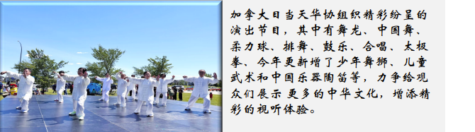 连续三年于Bridgwater Lakes Park举办大型户外庆祝活动以来,华协每年都推陈出新,演员义工们利用业余时间训练,为观众献上舞龙、柔力球、排舞、鼓乐、合唱、中国舞、太极拳等精彩节目,今年更新增了少年舞狮、儿童武术和中国乐器陶笛等,力争给观众们展示更多的中华文化,增添精彩的视听体验。