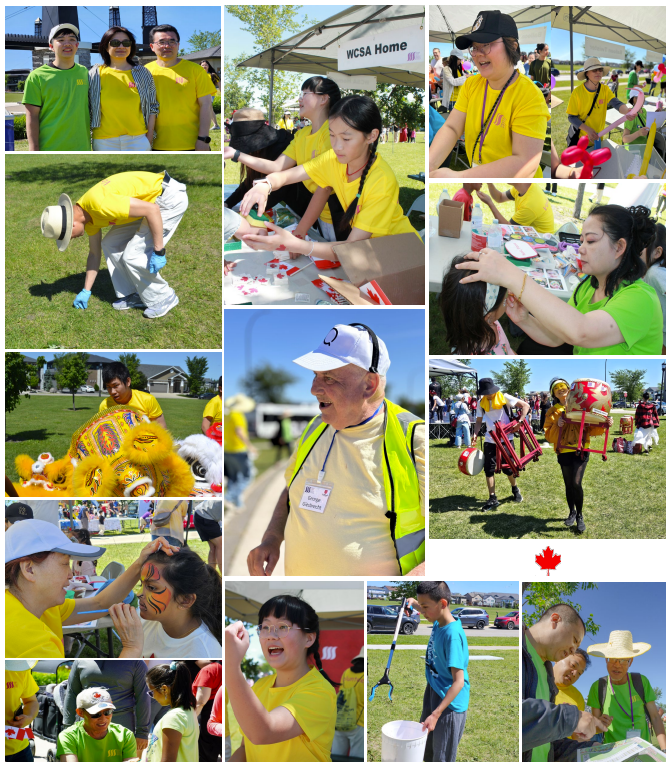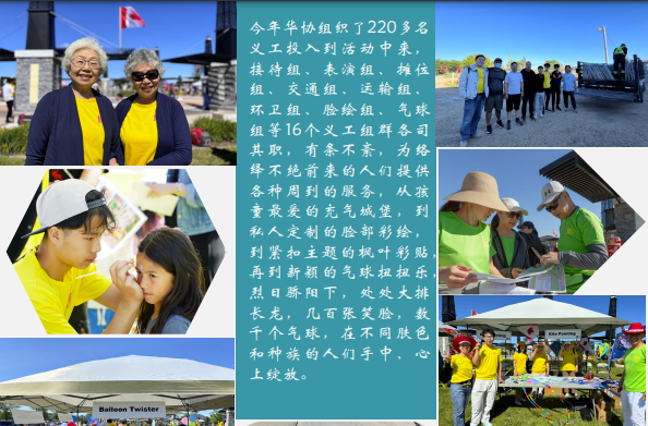 虽因临时改期带来些许变动,但在华协强大的组织协调能力下,仍有220多名义工投入到活动中来,接待组、表演组、摊位组、交通组、运输组、环卫组、脸绘组、气球组等16个义工组群各司其职,有条不紊,为络绎不绝前来的人们提供各种周到的服务,从孩童最爱的充气城堡,到私人定制的脸部彩绘,到紧扣主题的枫叶彩贴,到再新颖的气球扭扭乐,烈日骄阳下,处处大排长龙,几百张笑脸,数千个气球,在不同肤色和种族的人们手中、心上绽放。
