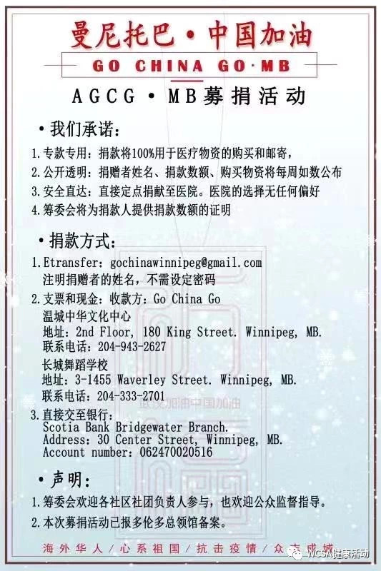 近日,温尼伯热心人士成立了为武汉疫情捐款的组织【曼尼托巴·中国加油】筹委会(AGCG·MB)。这个筹委会邀请了多家社区机构参加,群策群力为国内身处第一线的医生采购急需的医用物资。 通过接收温尼伯当地居民的募捐,以帮助武汉人们战胜疫情为己任,购买疫区急需的防疫物品,并尽快转交到武汉当地医护人员的手中。这个临时性的义工组织,目标明确,过程透明,不为私利,接受监督,保证要把募捐到的每一分钱都用在武汉人们身上。