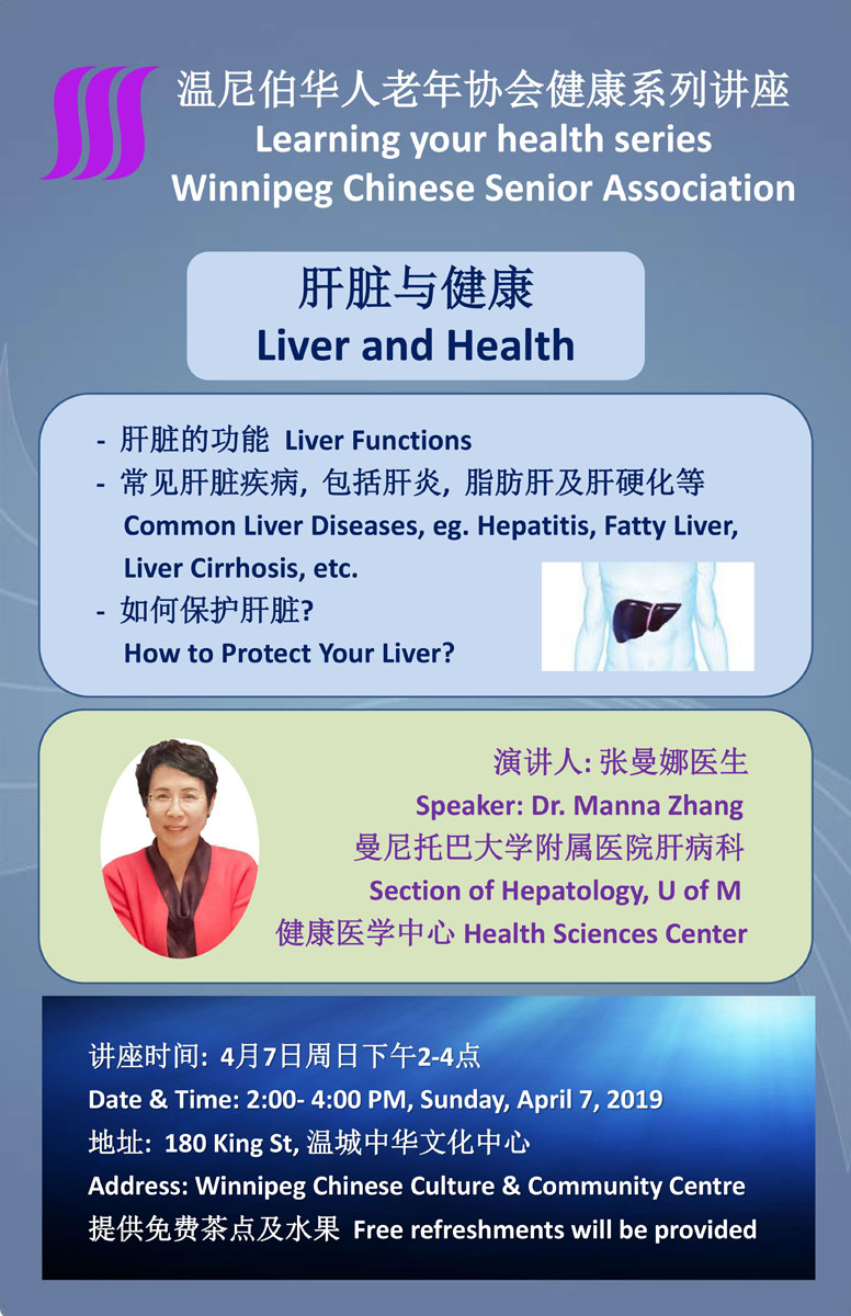 本次讲座主讲人张曼娜医生。张曼娜医生毕业于吉林省长春市的吉林大学医学院(原白求恩医 科大学)。曾在吉林大学第一医院肝病科从事临床和科研。现在曼尼 托巴大学附属医院和健康医学中心肝病科工作。张