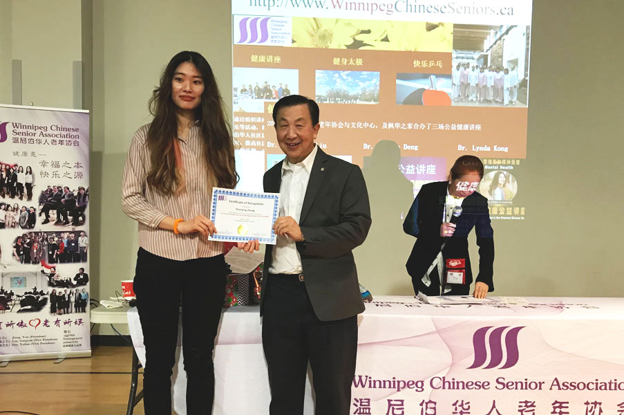 张医生的演讲由来自吉林大学的章钊颖同学提供普通话翻译。章同学是吉林大学白求恩医学部7年制第五年的学生, 现在曼大肿瘤和血液病研究所进行科学研究,她的志向是成为一名眼科医生。